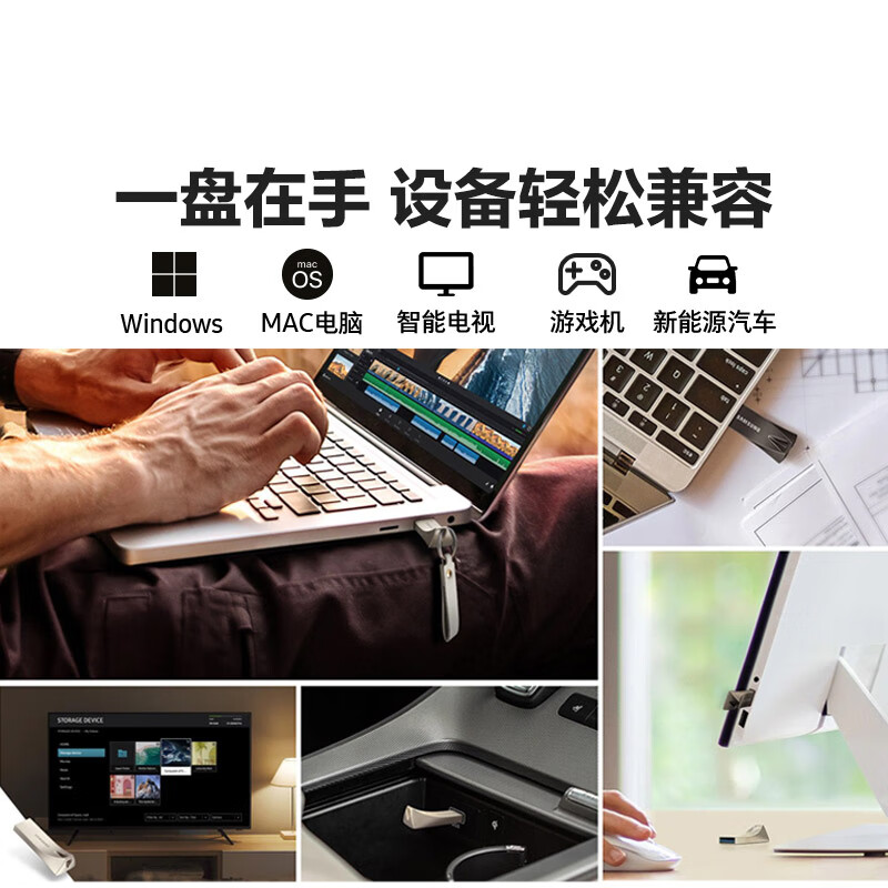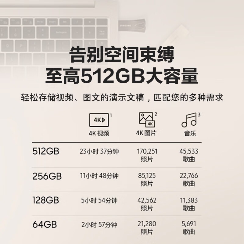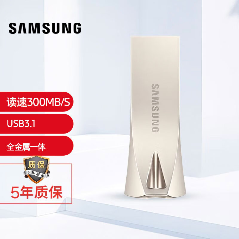 三星(SAMSUNG)64GB USB3.1 U盘 BAR 学习办公两用 金属高速优盘 小巧精致车载U盘 读速300MB/s(Gen 1) 香槟银