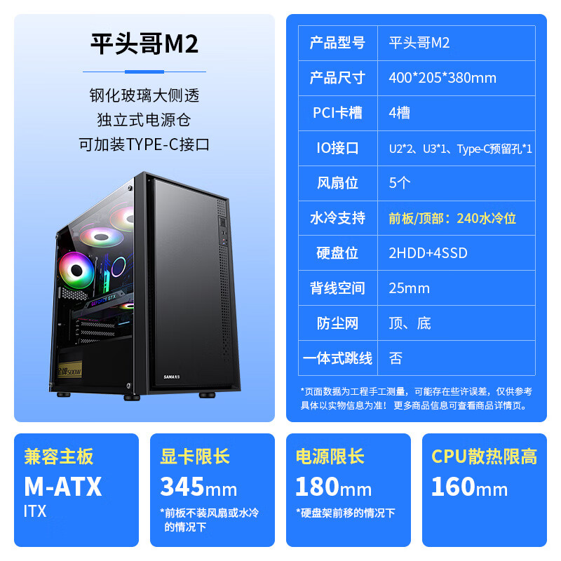 先马(SAMA)平头哥M2 电脑机箱台式机matx小机箱 玻璃侧透/支持240水冷/背线/USB3.0/独立电源仓/防尘易清洗